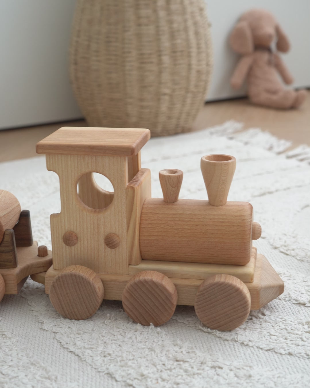 If you’re looking for a first train that’s as sweet as it is special—this is the one! Beautifully handmade and full of charm, this wooden pull-along train is perfect for little ones who are ready to roll.