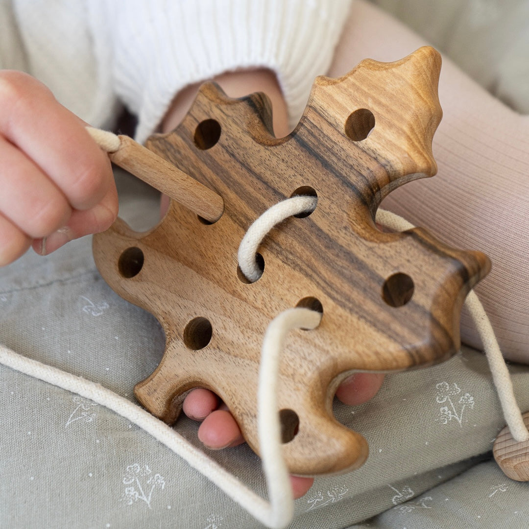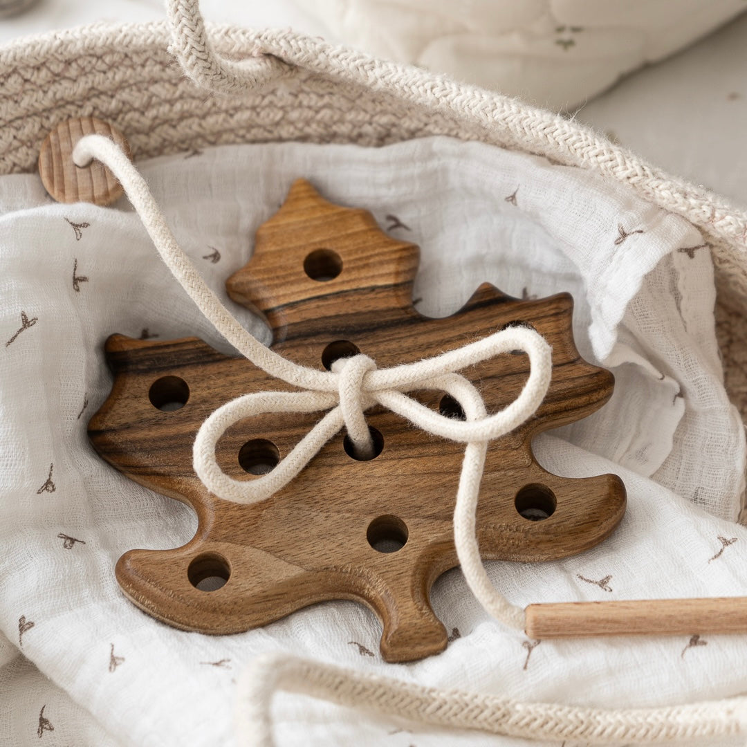 Our sweet Bear and Leaf threading toys are just right for little hands and curious minds. Perfect for keeping little ones busy while building big skills.
