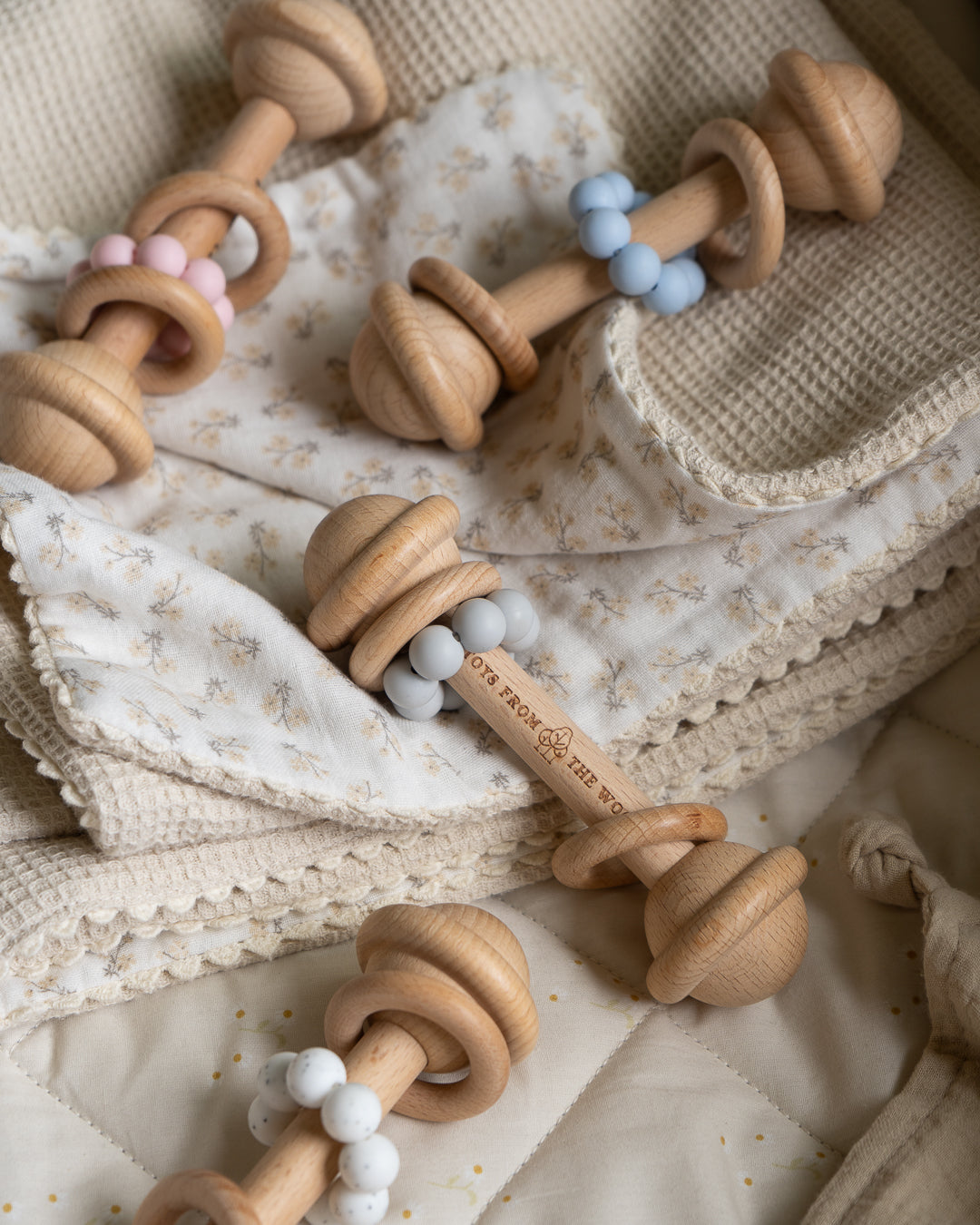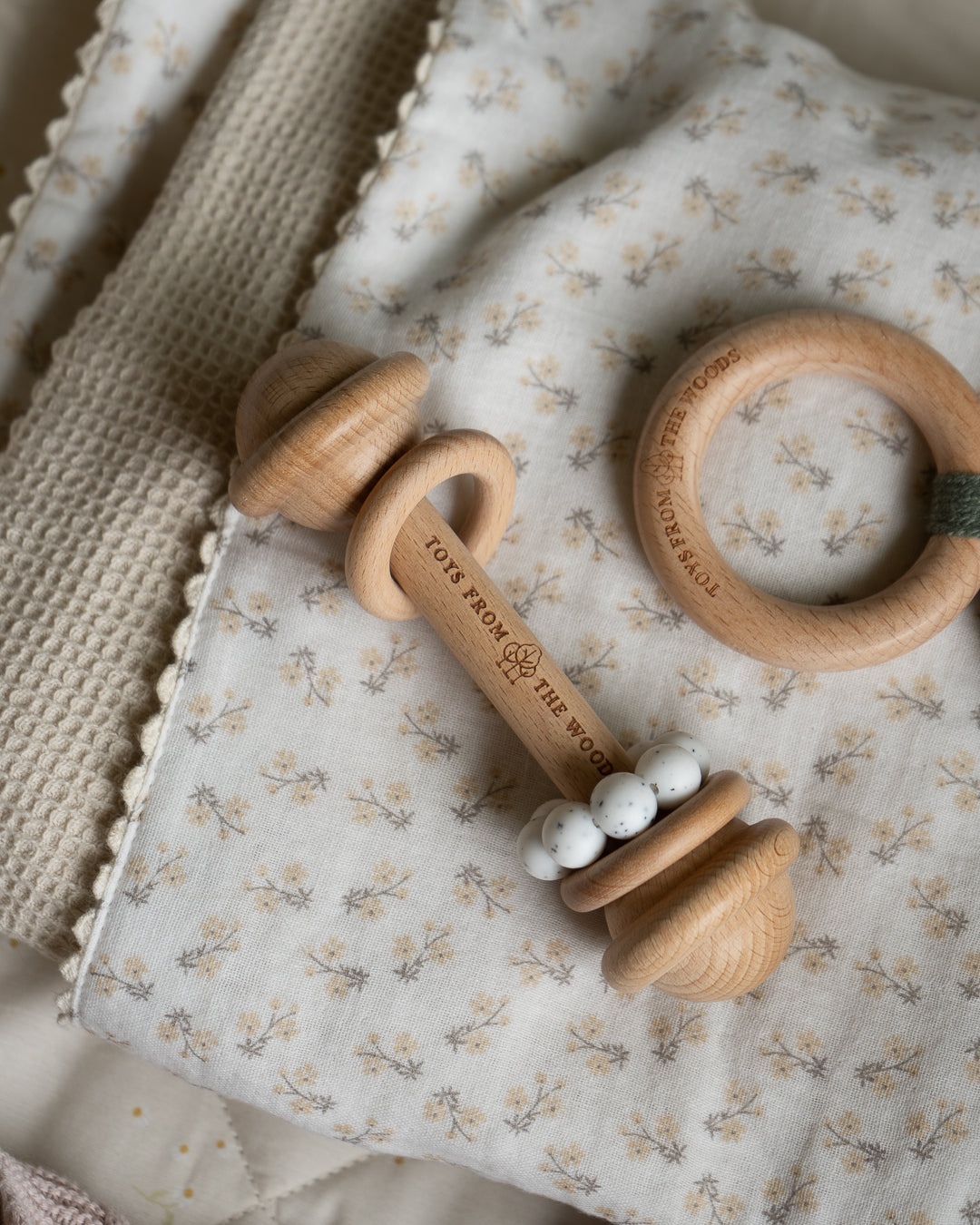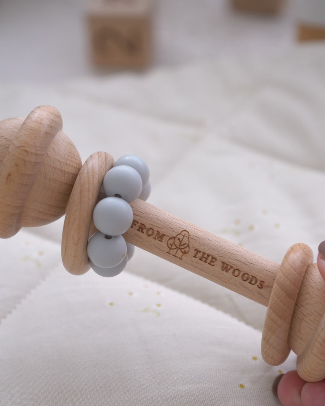 This stunning rattle features natural beech wood with Saturn-shaped ends, wooden rings, and soft silicone beads wrapped around the middle. The varied shapes and textures stimulate your baby’s senses, while the gentle rattling sound engages their curiosity.