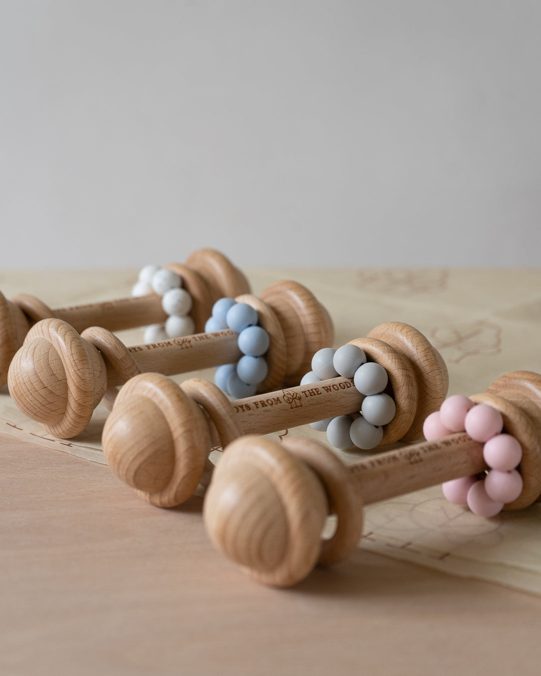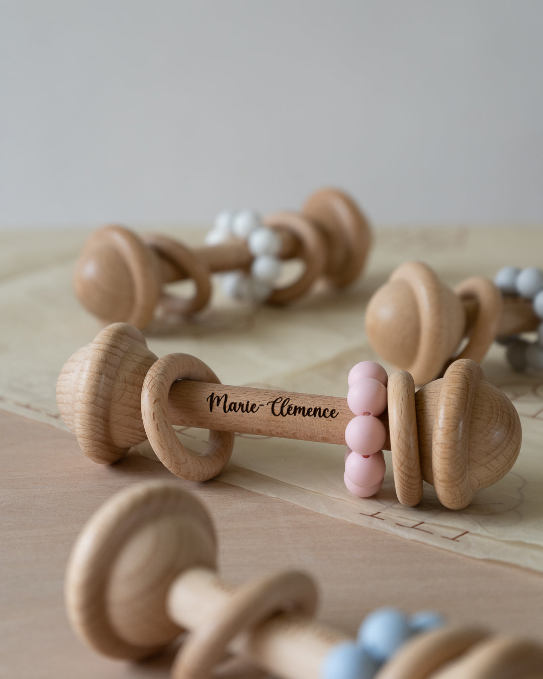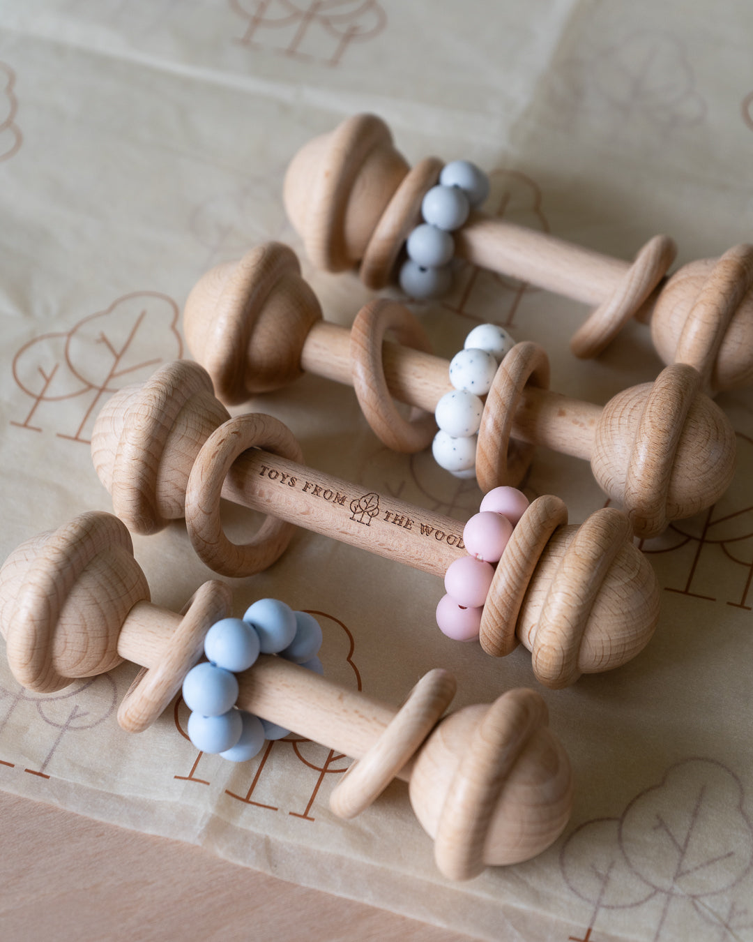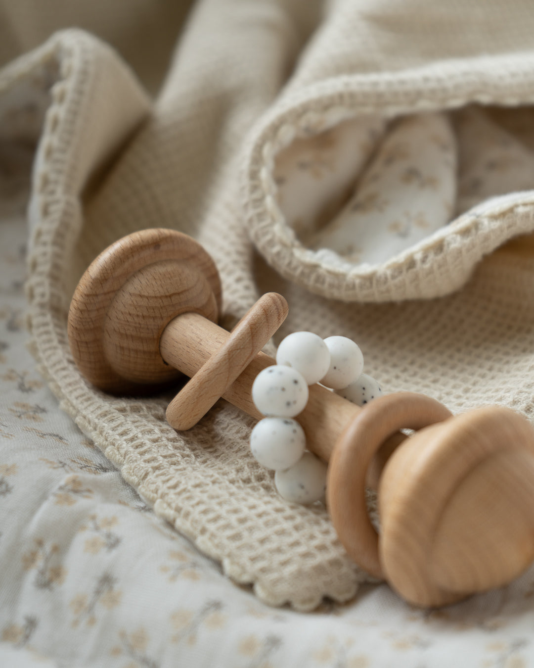 This stunning rattle features natural beech wood with Saturn-shaped ends, wooden rings, and soft silicone beads wrapped around the middle. The varied shapes and textures stimulate your baby’s senses, while the gentle rattling sound engages their curiosity.